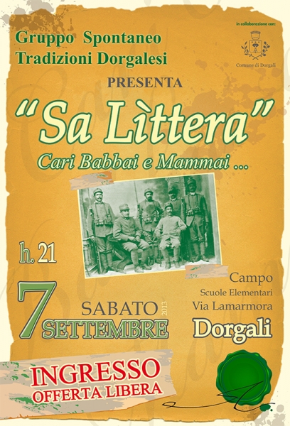Sabato 7 settembre, al campetto delle elementari (presso Via Lamarmora “Castula”) a Dorgali, Il “Gruppo Spontaneo Tradizioni Dorgalesi” ci porterà ancora una volta indietro nel tempo, negli anni ‘60. Dopo il successo ottenuto a teatro con il "tutto esaurito" del 7 luglio, gli attori cercheranno di replicare la commedia estemporanea "Sa Littera" esclusivamente in lingua sarda.