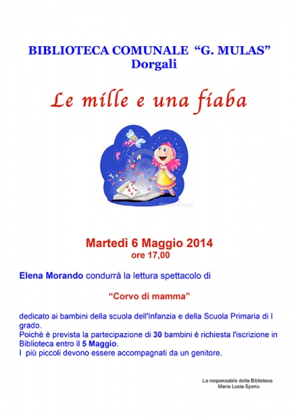 La Biblioteca Comunale “G. Mulas” organizza per il 6 maggio una manifestazione per i bambini di Dorgali e Cala Gonone: “Le Mille e una fiaba”.