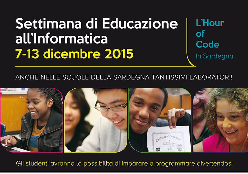 L’associazione Sardegna 2050 aderisce alla “Computer Science Education Week” l’evento globale che si svolge dal 7 al 13 dicembre 2015 e che promuove l’iniziativa Hour of Code, il cui obiettivo è che tutti provino durante la loro vita almeno un’ora di programmazione (in inglese coding).