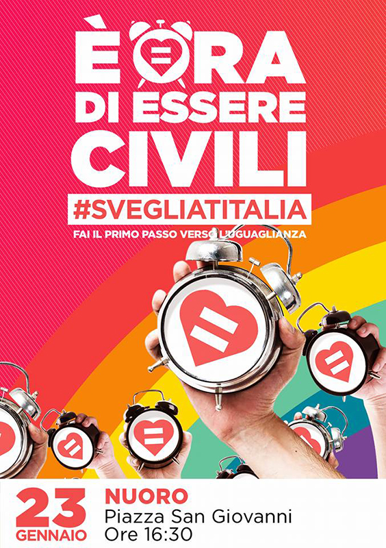 Sabato 23 gennaio alle ore 16.30 scendiamo in piazza per manifestare a favore delle unioni civili. Si parte da piazza San Giovanni per arrivare in piazza Vittorio Emanuele, dove si terrà il flash mob finale in cui faremo suonare nello stesso momento le sveglie dei nostri smartphone.