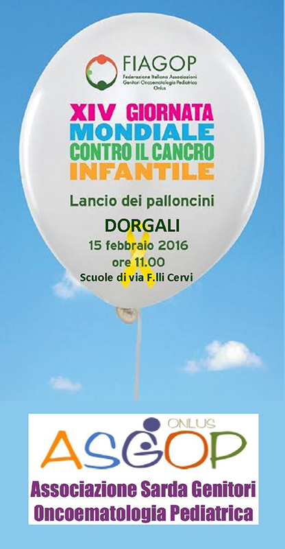 Lunedì 15 febbraio a Dorgali, in occasione della XIV Giornata Mondiale Contro il Cancro Infantile, si terrà alle ore 11:00 il lancio di 100 palloncini bianchi presso la sede di via F.lli Cervi dell’Istitutocomprensivo G.M. Gisellu, a cui prenderanno parte bambini, genitori, insegnanti e volontari ASGOP.