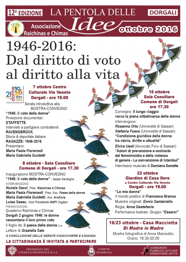 Il nutrito programma della Pentola delle idee di quest’anno prosegue sabato 15 ottobre ( ore 17,30 Sala Consiliare del Comune) con una serata intensa sul tema: Il lungo viaggio verso la piena cittadinanza delle donne e sabato 22 ottobre, ore 19:00 nel Giardino di casa Dore, con il reading di “Le mie donne” poesie di Francesca Branca. Dal 16 al 23 ottobre, a Casa Macciotta, Raichinas e Chimas ospita la mostra fotografica Di Madre in Madre di Anna Marceddu: matrilinearità e matriarcato in Sardegna (inaugurazione domenica 16 ore 11,00).