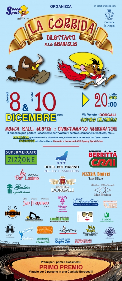 Bruno Riffaldi, emulando le gesta del papà , conquista alla grande la CORRIDA 2016. Lo spettacolo andato in onda giovedi 8 e sabato 10 dicembre al Centro Culturale di Dorgali era destinato alla raccolta fondi per l'ASD Speedysport Onlus, che da anni ha un obiettivo USARE LO SPORT come MEZZO PER RAGGIUNGERE LA PIENA INTEGRAZIONE DEI RAGAZZI CON DISABILITA'. La ASD ha pensato alla Corrida - come spiega Graziella Sale- consigliera e organizzatrice del'evento, perchè in questi anni il carico delle spese, che riguardano la manutenzione del parco pulmini, rischia di gravare sulla situazione economica dell'ASD. Dorgali ha risposto, come sempre, alla GRANDE, dimostrandosi un paese davvero solidale. La Speedy ha potuto contare su tante attività commerciali di Cala Gonone e Dorgali che hanno supportato l'organizzazione dello spettacolo, nonchè sull'Amministrazione Comunale di Dorgali, in prima fila, con gli Assessori Rosanna Fronteddu e Luciano Carta Brocca. 21 partecipanti alla serata finale, cantanti, comici, ballerini, tenores, inventori, tutti disponibili a offrire il proprio talento ed esibirsi con canzoni, balli, e spettacoli fantasiosi. Giudice delle esibizioni è stato un pubblico numeroso ma anche rumoroso che con applausi, fischi, hanno accompagnato le esibizioni dei concorrenti. La Corrida della Speedysport - come spiega la Presidente Francesca Lovicu - è riuscita nell'intento di intrattenere un pubblico partecipe, sorridente, allegro, coinvolgendolo nelle esibizioni dei dilettanti allo sbaraglio. All'interno dello spettacolo, è stato emozionante il momento dedicato a Marco Farris un giovane deceduto alcuni anni fa, che aveva partecipato da protagonista a tutte le edizioni della gara. La madre ha ritirato una targa ricordo, donata dalla Speedy e ricevuta, in memoria del figlio, dalle mani dell'Assessore al Turismo Luciano Carta Brocca. Un altro momento clou della serata è stata l'esibizione di Mauro Salis, grande comico nuorese e ospite d'onore della manifestazione, che ha strappato risate, sorrisi e tanti applausi al pubblico presente. La Speedy inoltre - continua la Presidente - ha presentato alla kermesse dorgalese ben 5 artisti: Valeria Patteri, Eliano Cucca, da dorgali Danilo Vedele da Galtelli , Marianna Peduto da Posada, Gianni Patteri che ha cantato con i tenores Sant'Elene. Grandi applausi hanno ricevuto anche il balletto dei ragazzi disabili che hanno voluto presentare al pubblico dorgalese l'esito finale del laboratorio di danza integrato, curato da Lucia Orru. Nadia Cosseddu, Gonaria Chessa, M.Grazia Lai, Pasqualina Porcu, Pasqualina Mameli, Marina Bacchitta, Tony Cucca, Cristian Sagheddu, Daniele Brocca, Danilo Monni, Mirko Flore, Riccardo Puggioni, Efisia Flore, Ignazia Bacchitta, Fabio Pittalis hanno deliziato la platea accompagnati dall'inarrestabile pupazzo SPEEDY Gonzalez. Insomma un grande risultato, conseguito con grandi sacrifici e tanta buona volontà dai genitori e familiari della Speedysport, che hanno saputo programmare e organizzare un evento davvero unico. Diamo appuntamento alla prossima edizione, nel 2017, chiude Rossella Monni - altro consigliere dell' ASD - con la speranza di poter organizzare una serata ancora più bella e ricca di sorprese.