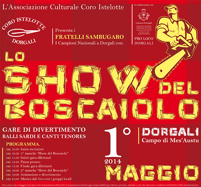 Arriveranno oggi i protagonisti dello “Show del Boscaiolo” in programma per il 1° maggio a Dorgali. Sono i fratelli Michele e Giorgio Sambugaro, boscaioli di professione e campioni italiani nella specialità con la motosega, fanno entrambi parte della squadra nazionale e da anni raccolgono consensi nei loro spettacoli proposti in tutta Italia.