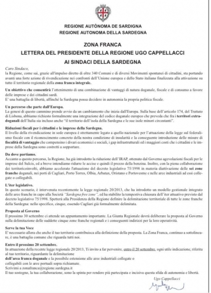 È arrivato l'atteso comunicato rivolto ai sindaci della Sardegna, una lettera aperta pubblicata su una pagina acquistata nei due quotidiani sardi. Così il Presidente della Regione, Ugo Cappellacci, ripropone la zona franca ricordando che "il prossimo 30 settembre ci attende un appuntamento importante. La Giunta Regionale dovrà deliberare la proposta al Governo sulla delimitazione delle cinque zone franche regionali (essendo Cagliari già formalmente delimitata) e i conseguenti indirizzi per la loro operatività . Serve la tua Voce. È necessario allora che anche il tuo territorio contribuisca alla definizione della proposta".