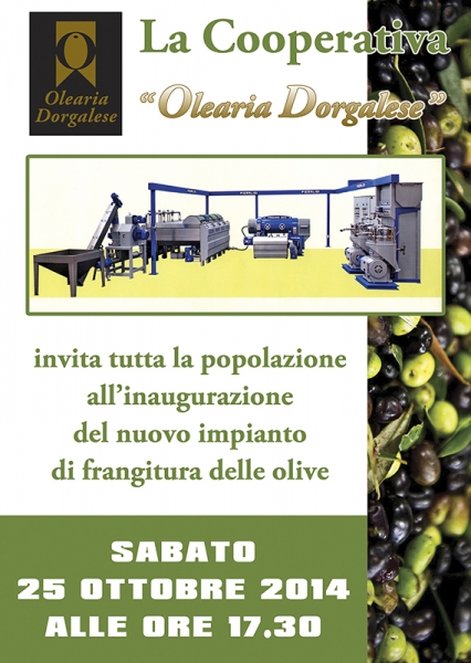 La Cooperativa Olearia Dorgalese invita tutta la popolazione ai festeggiamenti per l'inizio di una nuova stagione dell'oleificio. L'impianto permetterà alla Cooperativa di stare al passo con i tempi, sempre più contrassegnati dalla ricerca di materiali innovativi affidabili e di soluzioni tecniche rispettose dell'ambiente.