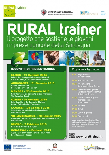 Partiranno dalla prossima settimana una serie di incontri seminariali di orientamento in diversi territori della regione. Per maggiori informazioni sul progetto, realizzato da Bic Sardegna in collaborazione con Laore, si può consultare il sito internet www.ruraltrainer.it o la pagina Facebook Rural Trainer.