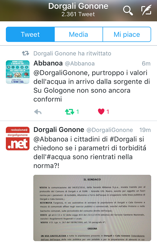 Cittadini di Dorgali e Cala Gonone, "purtroppo i valori dell'acqua in arrivo dalla sorgente di Su Gologone non sono ancora conformi". Abbanoa risponde al nostro tweet e, almeno così, fa chiarezza sull'impossibilità di poter usare l'acqua che sgorga dai nostri rubinetti a fini alimentari.