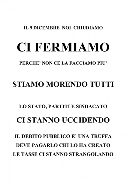 Ecco il volantino che troverete, lunedì 9 dicembre 2013, nelle attività serrate contro “il far west della globalizzazione che ha sterminato il lavoro degli italiani”.