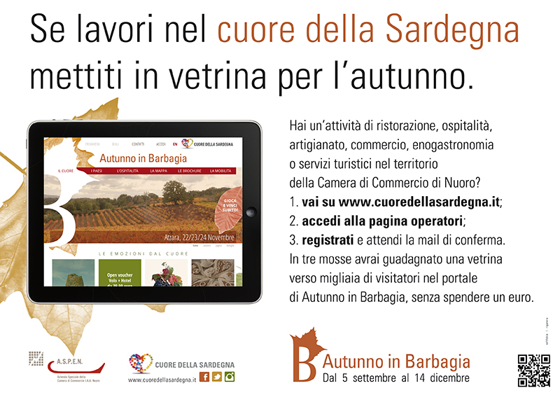 Tutte le imprese (commercio, artigianato, ricettività, agroalimentare, servizi turistici, servizi culturali) della CCIAA di Nuoro potranno pubblicare le informazioni sulla propria attività in modo autonomo e gratuito, così da ottenere visibilità in tutte le manifestazioni del territorio, ad iniziare proprio da Autunno in Barbagia.