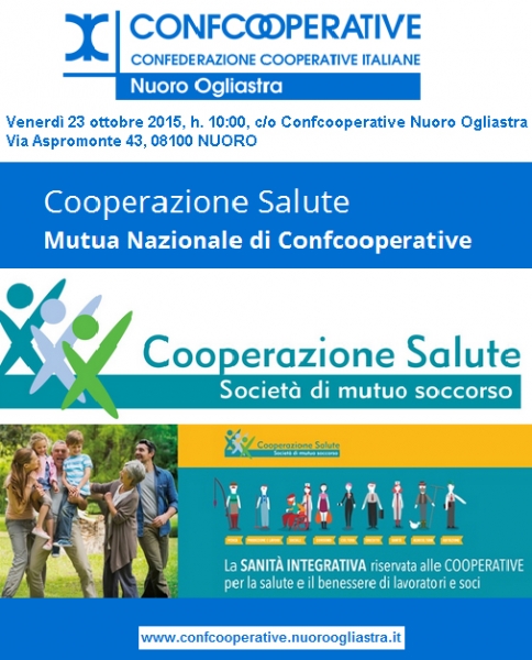 Venerdì 23 ottobre 2015 alle ore 10:00 presso la sede di Confcooperative Nuoro Ogliastra, in Via Aspromonte 43 a Nuoro, si terrà un incontro rivolto alle cooperative di tutti i settori, nel quale verranno presentati i servizi offerti dalla Mutua Nazionale Cooperazione Salute.