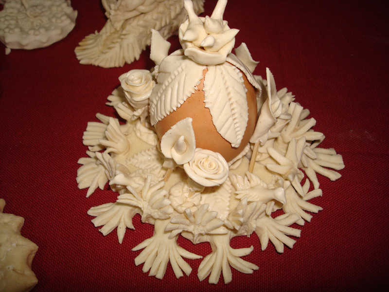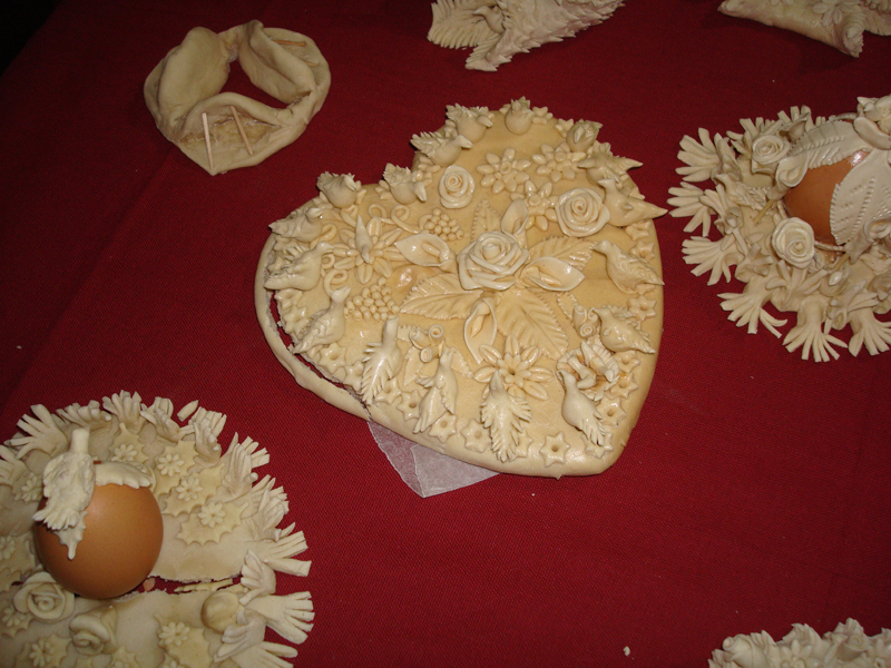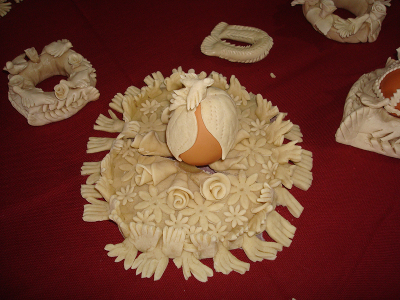 Non stampi industriali, non figure di serie omologanti, ma un oggetto vivente, che scorga dal proprio istinto e dall'estetica, datore d'amore. E infatti che cosa a Pasqua spinge la mamma a far sa coccone chi sou? È un gesto d'amore verso il proprio bambino che fin da piccolo viene educato alla bellezza. Quel canestrino intrecciato che porta l'uovo simbolo di fecondità , circondato da fiorellini e foglioline di acanto danno al piccolo il senso di religiosità che porta la festa. L'oggetto e la forma particolare introducono alla solennità di quella domenica diversa dall'altra. È così anche per il giorno del matrimonio per cui si preparano bomboniere e cestini di pane lavorato e modellato a cerchi e a cuore degni dell'arte rinascimentale del cesello di Benvenuto Cellini.
